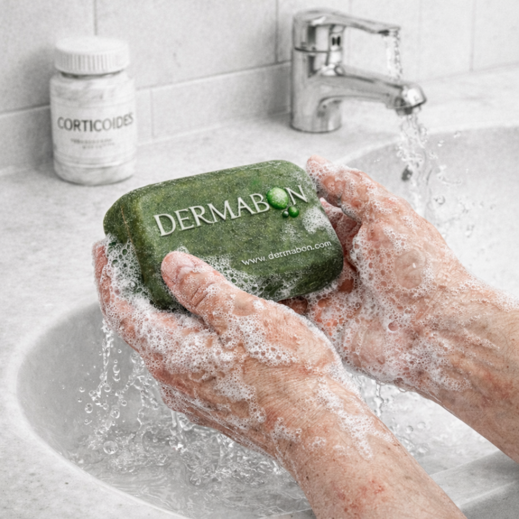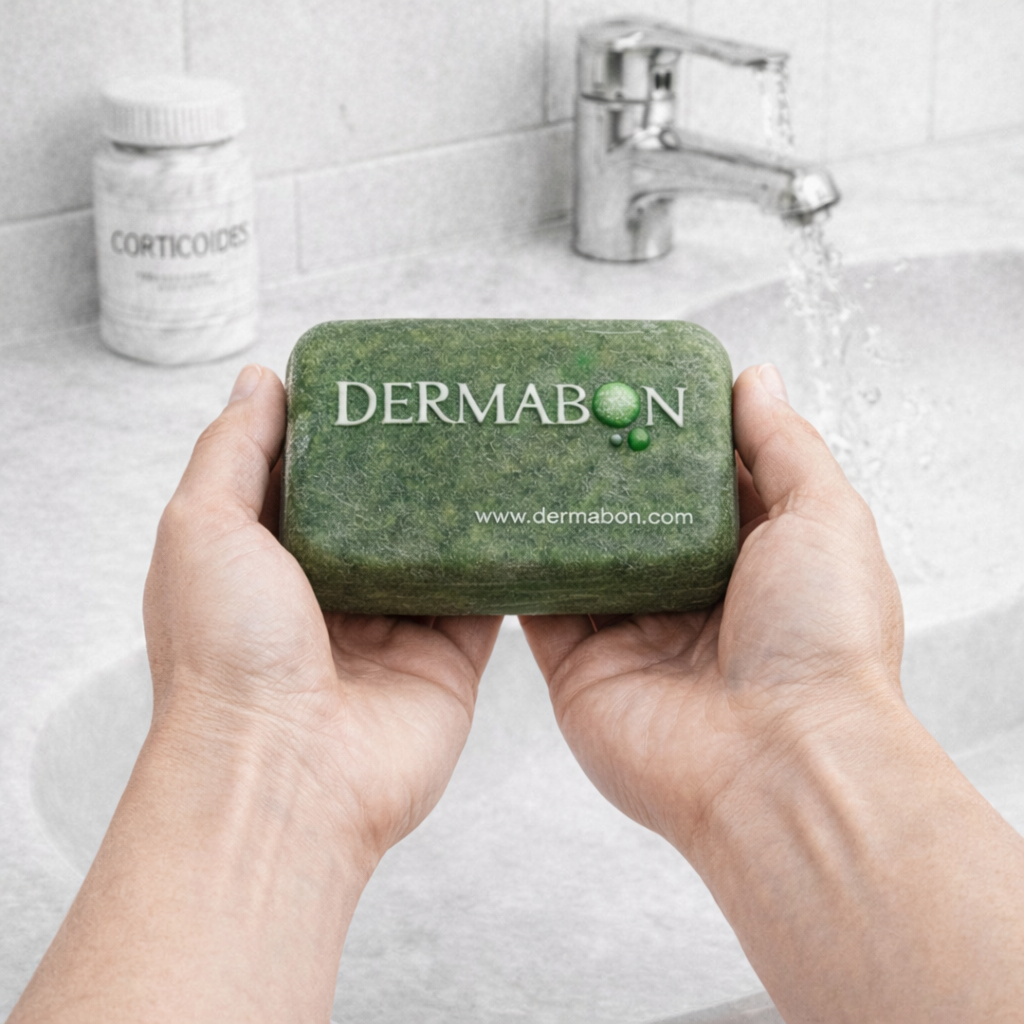 Jabón Dermabon; producto natural libre de corticoides. Su presentación es en barra de jabón de 90gr.; controla de manera efectiva la psoriasis, dermatitis, caspa y seborrea. Sin contraindicaciones.